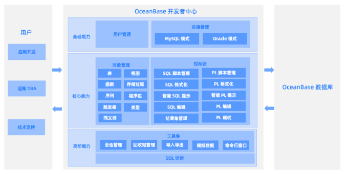 OceanBase 社区版 ODC(OceanBase Developer Center)作为 OceanBase 数据库量身打造的企业级数据库开发平台,旨在帮助企业安全、高效地使用数据库,同时提升企业内使用数据库的相关角色间的协作效率。从 3.1.2 开始正式推出社区版 ODC,支持连接 OceanBase 社区版 MySQL 模式下的数据库,可根据开发需求打开 SQL 窗口、匿名块窗口以及命令行窗口。在工具层面为数据库开发者提供了多种数据库对象的可视化管理能力、WebSQL、SQL 诊断、模拟数据、会话管理、回收站管理以及导入导出等功能。同时在平台层面提供了管控台能力,用户可通过管控台实现资源和权限的统一管理。