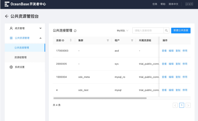 2. 连接管理:提供 OceanBase MySQL 模式服务。支持用户创建数据库连接和保存创建的连接信息,同时提供一键复制和删除连接的能力。