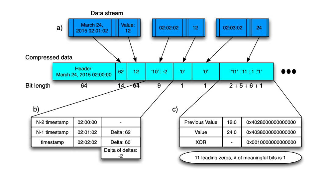 每块数据的开头记录起始时间戳 第一条样本数据 时间戳存储与起始时间戳的差值 数据值按原值存储 从第二条样本数据开始 时间戳存储 delta of delta 数据值按差值存储