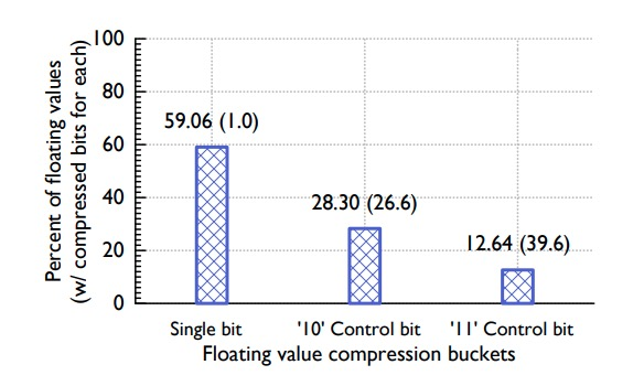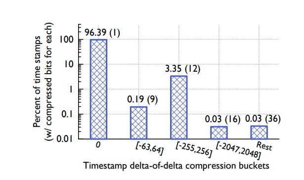 算法中为 D 选择的区间在真实数据能够获得最大的压缩率。一个时序数据可能随时出现数据点丢失,于是可能出现这样的 delta 序列:60, 60, 121, 59,这时候 delta of delta 就是:0, 61, -62,这时候就需要存储 10 bits 数据。下图是时序压缩的统计表现: