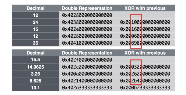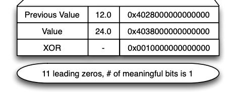 通过分析 ODS 的数据,Gorilla 团队观察到大部分相邻的时序数据值之间不会有很大的变化。根据 IEEE 754 中定义的浮点数编码格式: