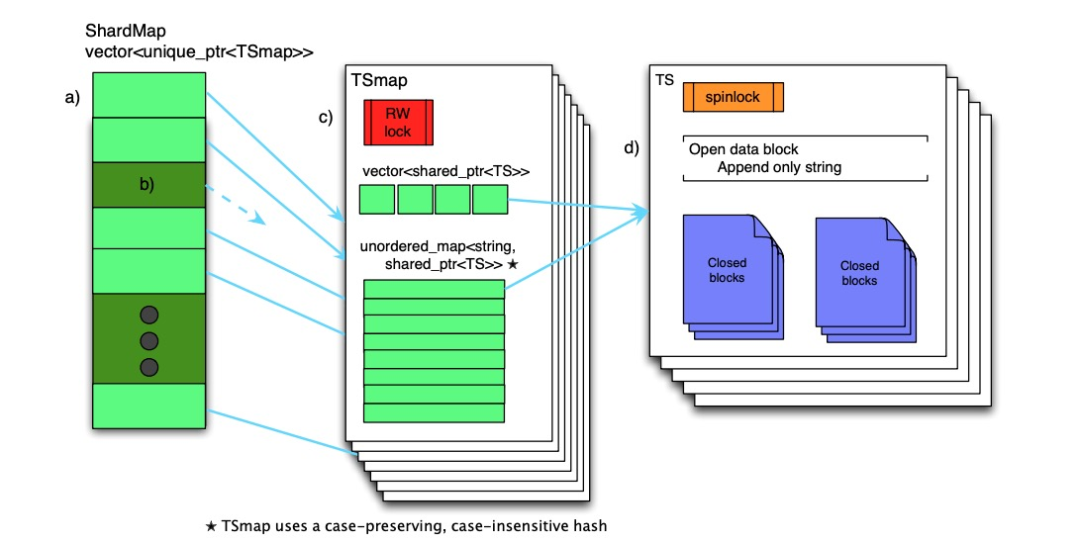 由于 Gorilla 的设计是将所有数据放在内存中,因此它的内存数据结构与其它的时序数据库有所不同。也得益于这样的设计,开发者也可以将 Gorilla 看作是基于磁盘的时序数据库的 write-through cache。