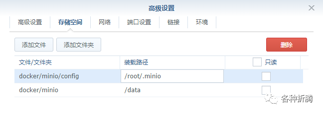 docker/minio/config | /root/.minio | 存放设置 |