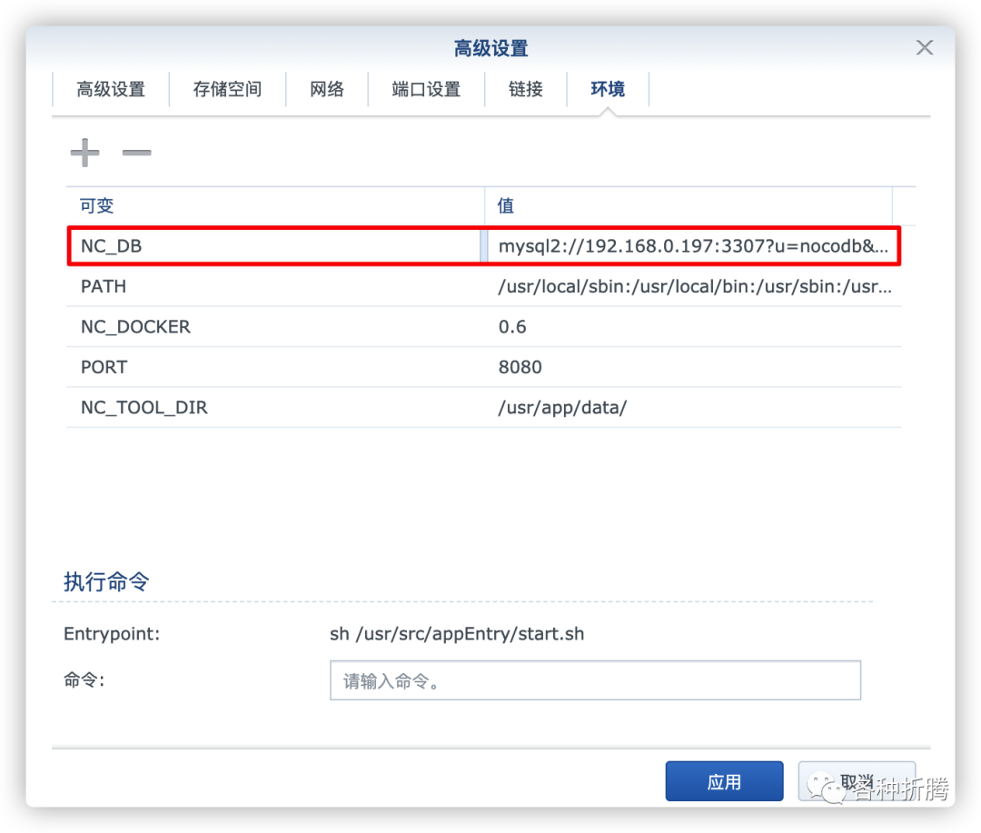 NC_DB | 数据库连接参数,mysql2://群晖IP:3307?u=用户&p=密码&d=表 |