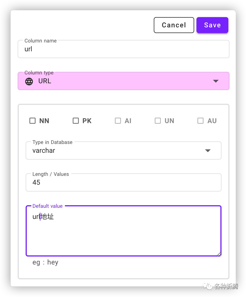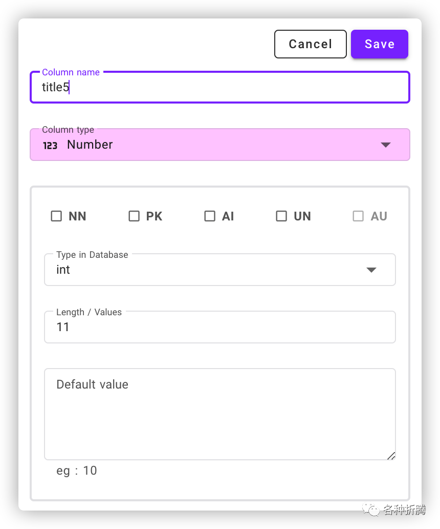 弹出表单中可以填写列名、类型、长度等,其中类型非常丰富