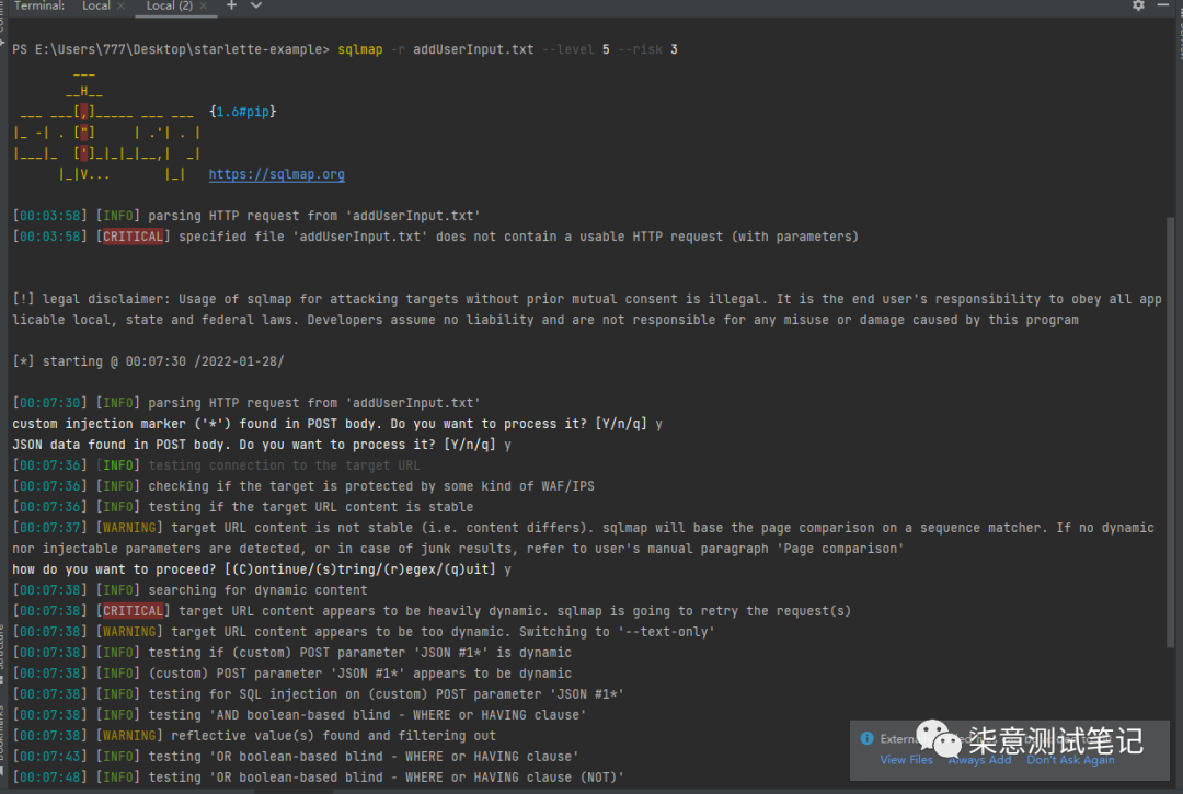 # 安装sqlmappip install sqlmap# 进行SQL注入扫描, sqlmap详细用法前往sqlmap官网学习sqlmap -r addUserInput.txt --level 5 --risk 3