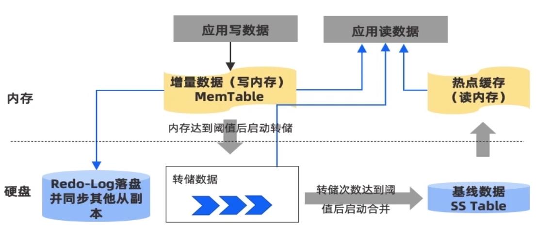 这样的好处是内存中的增量数据是顺序写到磁盘,效率比随机写更高、同时延长了磁盘寿命。另外基于LSMTree的设计,数据在磁盘上默认是按主键有序排列,内存中的增量数据与磁盘的基线数据进行合并时,数据会重新被排列,可避免存储空间碎片问题,提高利用率。