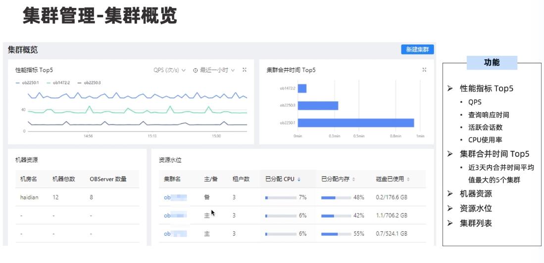 OCP(OceanBase Cloud Platform)是一款以OceanBase为核心的企业级数据管理平台,通过可视化的体验可高效管理OceanBase集群,支持高可用性、最多可同时管理500台主机、响应速度可达到秒级。