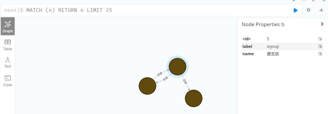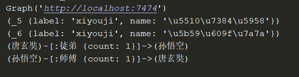 # coding:utf-8from py2neo import Node, Relationship, Graph, NodeMatcher, RelationshipMatcher##连接neo4j数据库,输入地址、用户名、密码graph = Graph('http://localhost:7474', auth = 'neo4j', password='******')##创建结点node_1 = Node(label='xiyouji', name='唐玄奘')node_2 = Node(label='xiyouji', name='孙悟空')node_3 = Node(label='xiyouji', name='猪八戒')graph.create(node_1)graph.create(node_2)graph.create(node_3)##创建关系# 分别建立了node_1指向node_2和node_2指向node_1两条关系,关系的类型为"徒弟、师傅",两条关系都有属性count,且值为1。node_1_2 = Relationship(node_1, '徒弟', node_2)node_1_2['count'] = 1node_2_1 = Relationship(node_2, '师傅', node_1)node_2_1['count'] = 1node_1_3 = Relationship(node_1, '徒弟', node_3)graph.create(node_1_2)graph.create(node_2_1)graph.create(node_1_3)#简单打印print(graph)print(node_1)print(node_2)print(node_1_2)print(node_2_1)