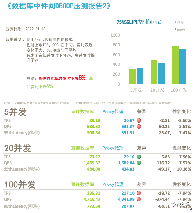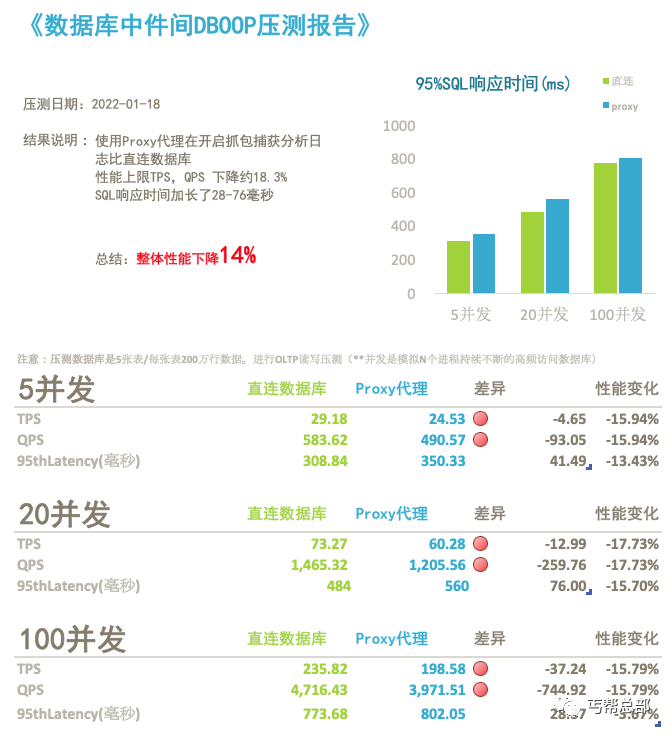 在高性能模式下,Proxy和直连数据库相比性能下降不明显,在SQL日志捕获模式下,Proxy和直连数据库有14%的性能损失。