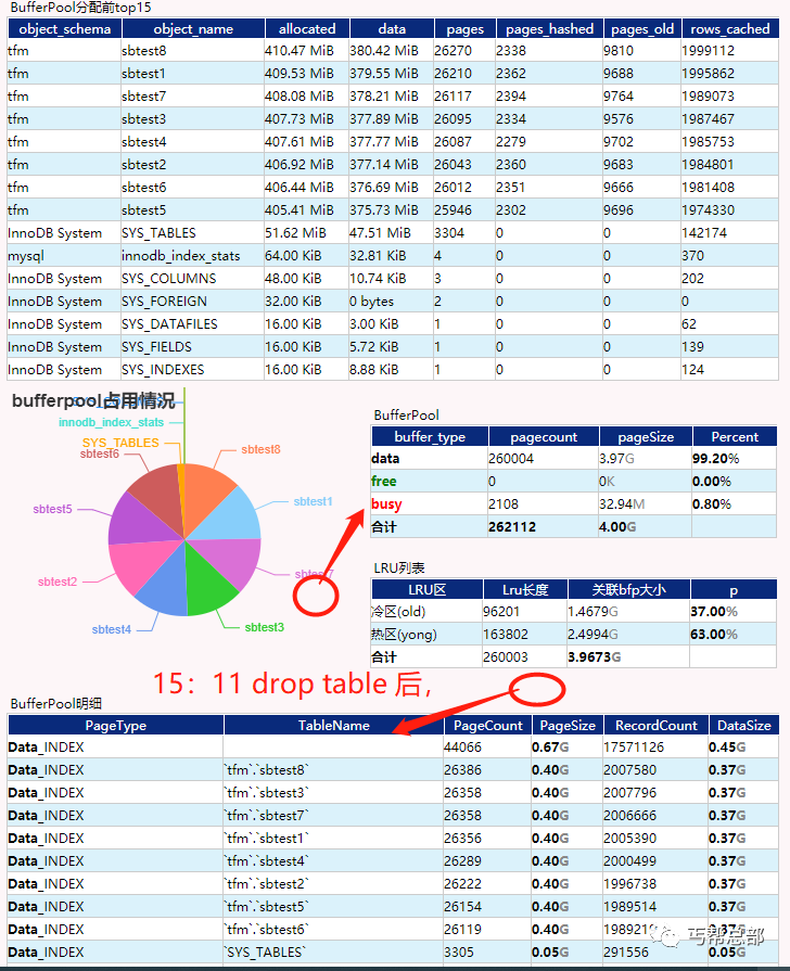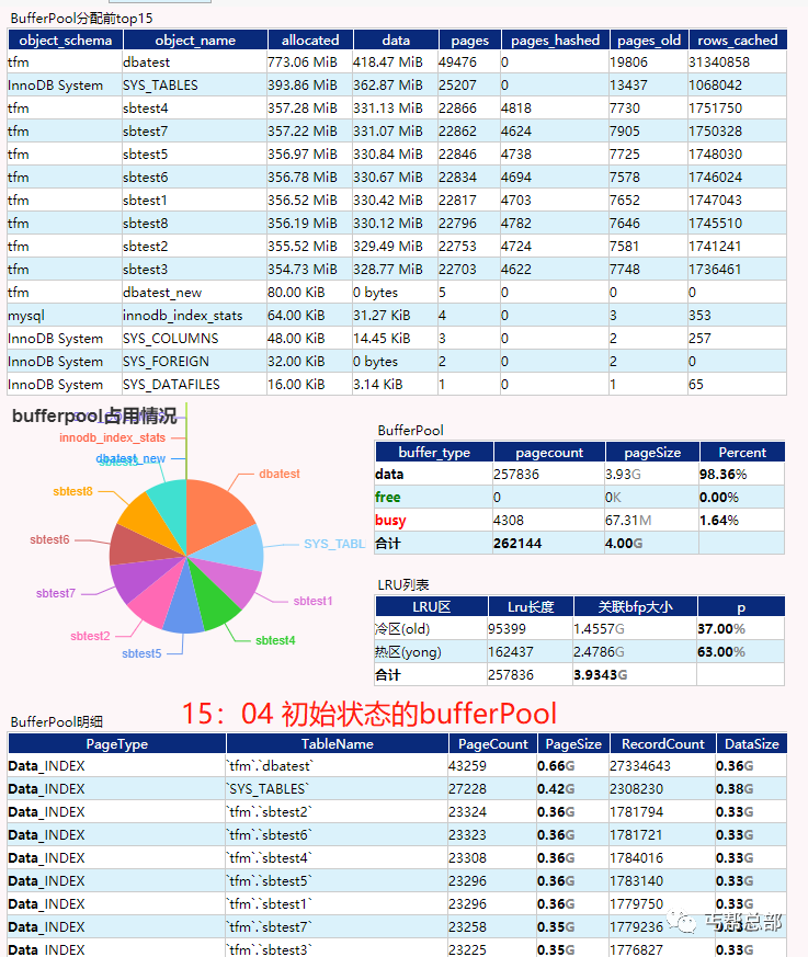 下面我们开始我们第二个测试,测试过程中,用一个精心设计过的BufferPool占用情况分类报表,来展示这仅有的4G内存的BufferPooL各阶段的情况