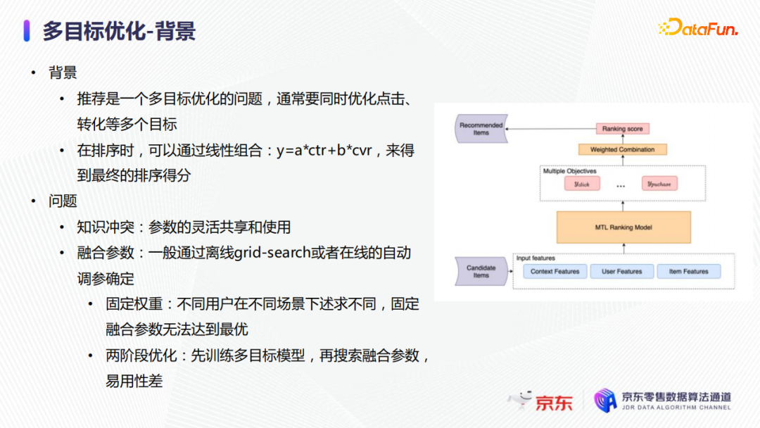 推荐是一个多目标优化问题,实际上在线上我们有大约七到八个目标需要优化。为了简化呈现,这里就以点击和转化为例。上图右侧是传统的多目标优化模型。最底层是模型的输入特征,中间是多目标模型,之后连接了一个combination层将不同的目标预测值结合到一起,最后使用其进行排序。