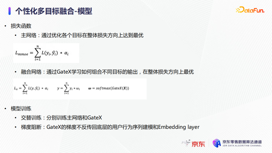 A:多目标融合模型的主网络和融合网络分别对应着两个损失函数和两个优化器。我们会分别训练这两部分网络,其中主网络输出的是多目标的预测值,比如点击率和转化率;另一个网络输出的是多目标预测值的融合权重,比如点击率的权重和转化率的权重。最终,模型使用点积的方式将多个目标的输出融合为一个预测值。在优化思路上,我们希望主网络优化各个目标的参数来达到最优;融合网络不影响主网络的更新,它学习如何组合主网络不同目标的预测值,来使得最终的排序能在优化方向上最优。