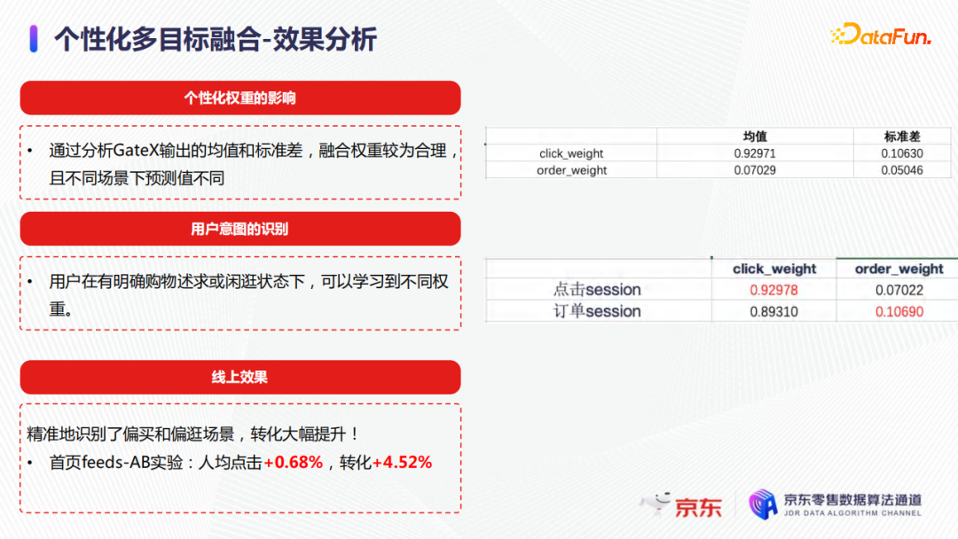 首先通过分析融合网络的均值和标准差,我们发现模型端到端学习出的权重值与我们离线通过参数搜索得到的最优值比较接近,结果较为合理;此外融合网络的输出具有样本级别差异,到达了个性化效果。然后我们对比了闲逛和购买场景的输出差异,在点击session下,点击融合权重平均是0.92,订单session中对应的权重下降为0.89;而在订单session中,订单的融合权重对比点击session会有比较大的提升。最终线上的效果也证明了模型可以精准识别用户属于偏买还是偏逛的类型,转化率有了大幅提升。除了首页之外,我们还将该方法应用到直播和购物车等不同排序模型上,其转化率都得到了明显提升,证明了方法的有效性和通用性。