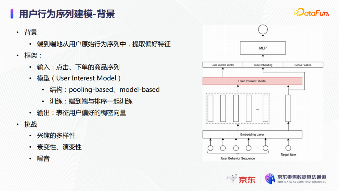 接下来介绍用户行为序列建模的工作。整个用户行为序列建模的目的是想从用户的原始行为序列中学习用户的偏好,这是个性化推荐中最重要的一个技术分支。它的整体技术框架如上图所示,模型的输入是用户原始点击或者下单行为的序列,之后通过一个User Interest 模型来输出表征用户偏好的稠密向量。User Interest模型可以是pooling-based也可以是model-based,一般与排序任务一起端到端训练。
