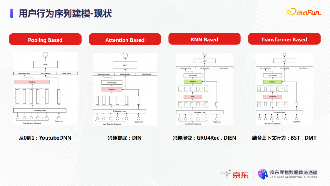 用户行为序列建模在最近几年发展较快。第一个主要工作就是YoutubeDNN的Pooling Basded的方法,主要问题是信息丢失严重,兴趣表征与待排商品也没有任何相关性。为了解决这些问题,基于attention的模型(如DIN)被提出,它可以从用户行为序列中挑选出与待排商品比较相关的行为特征,主要问题是无法建模衰变性或者演变性,不同时间或者次序的行为表征的兴趣没有差异性。之后基于RNN-based的模型解决了这一问题,但是这类模型受顺序推理的限制,无法建模较长的序列。在工业界RNN-based的序列模型通常只能对大约50个行为进行建模。目前业界应用最广泛的是基于Transformer的方法,它对用户行为序列的表征能力更强,且在一定程度上可以无视序列的长度。此外,虽然模型结构比RNN更复杂,但是由于模型自身已于并行的特点,它在工程上更好被优化。