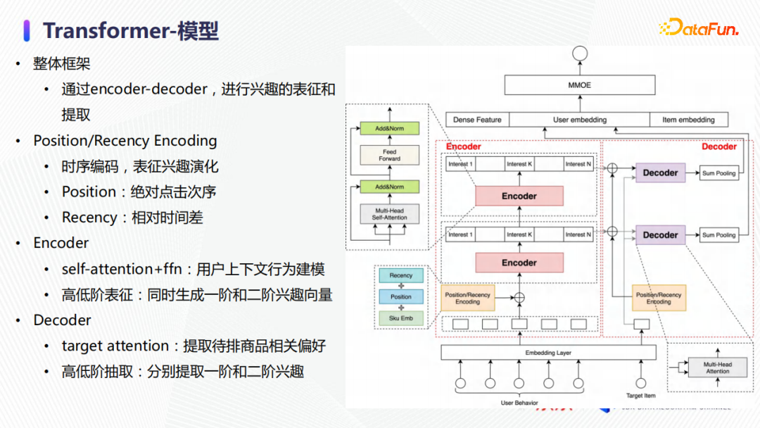 我们的行为序列建模模块主要以Transformer为基础,并针对电商领域用户行为的特性进行了相应优化。整体框架如上图右侧所示,采用一个encoder-decoder的结构来对用户兴趣进行表征和提取。用户的偏好是多样性的,如何建模不同时期的偏好以及相应的演变是一个非常有挑战的工作。原始NLP Transformer采用position encoding来补偿模型所丢失的位置信息。借鉴这一想法,我们在相同位置进行了时序编码,除了位置信息(position encoding),还增加了时间差(recency encoding)的编码信息,并通过直接相加来融合。Position和recency embedding与排序模型一起,端到端学习用户行为次序和时间对兴趣强弱的影响。