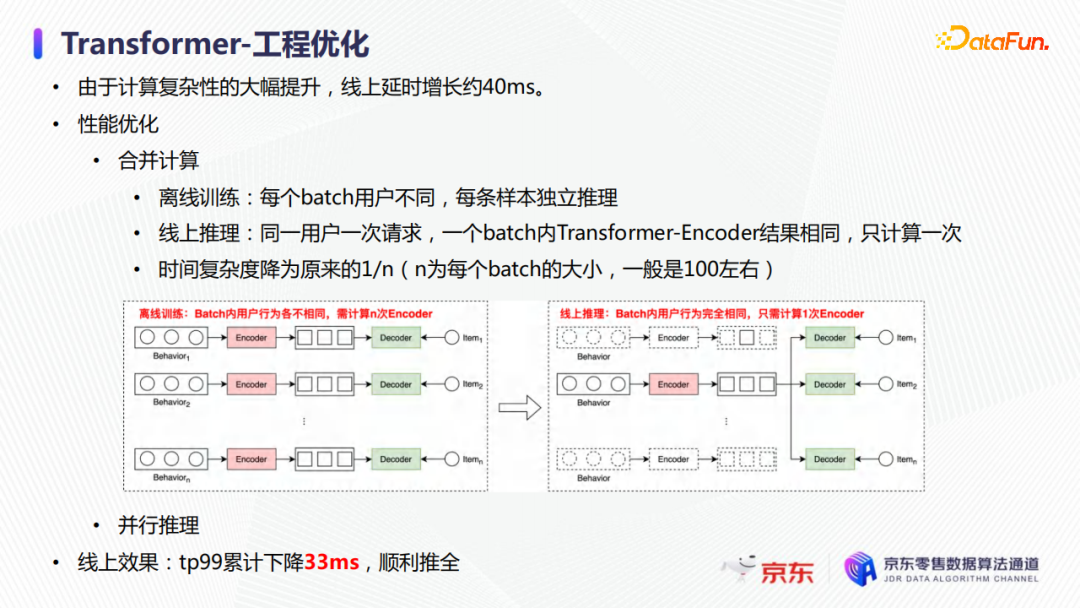 在工程上,由于模型计算复杂性的大幅提升,线上延时增加了约40毫秒,无法满足上线要求。为了解决这个问题,我们通过合并计算和并行推理来优化线上延时。在离线训练时每个batch的样本属于不同的用户,那么我们需要对batch中每个的行为序列进行独立的encoder推理,其时间复杂度是立方级的;但是在线上推理时,同一用户一次请求,一个batch内的encoder推理结果相同,那么我们只要计算一次即可,时间复杂度就可以降低为平方级。此外,通过调整计算图的执行顺序使得多个图可以同时去推理。最终从线上效果来看,tp99累计可以下降至33毫秒,使得模型满足全量上线要求。