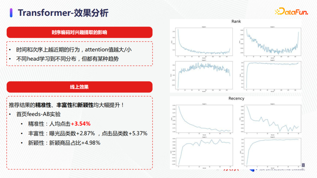 最后,我们对模型进行了离线分析,希望研究时序编码是否在端到端学习中学习到足够的信息。从业务上来讲,我们认为用户越近期的行为对当前的用户偏好影响越大。从上图右侧的结果展示了模型的多个head学习的信息。我们可以看到行为次序越靠后,纵坐标表示的attention值会有某种比较明显的倾向性,表明模型确实学习到了兴趣的演变特性。模型上线后,推荐结果的精准性、丰富性和新颖性均得到大幅提升。在首页feed流,人均点击提升了3.5%,这也是我们使用深度模型后单次优化得到的最大提升。