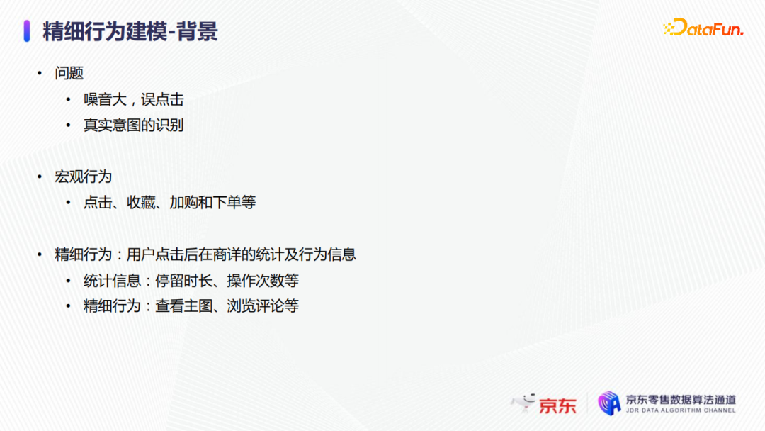 现在介绍一下我们在精细行为建模方向的工作。用户的行为中往往包含较多的噪声,包括一些误点击操作,需要从充满噪声的序列中识别用户的真实意图,因此我们提出了基于精细行为的兴趣建模来优化这一问题。