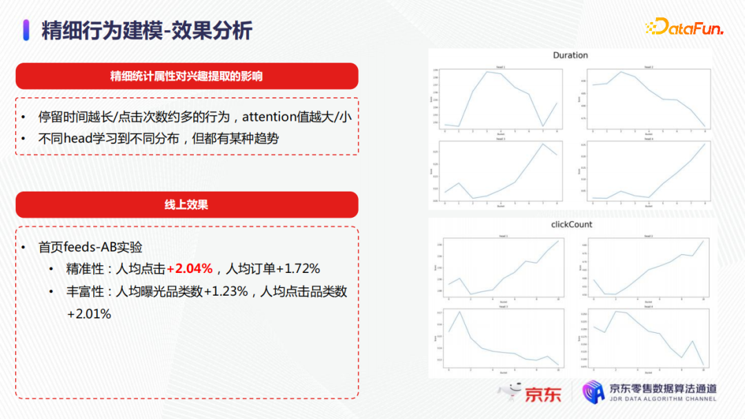 最后我们分析了精细统计属性对兴趣提取的影响,与之前的模型结论类似,我们也能观察到停留时长和attention之间存在某种趋势,停留越久attention值就越大。最终效果,在首页feeds流,人均点击提升2%,转化也提升了1.7%。