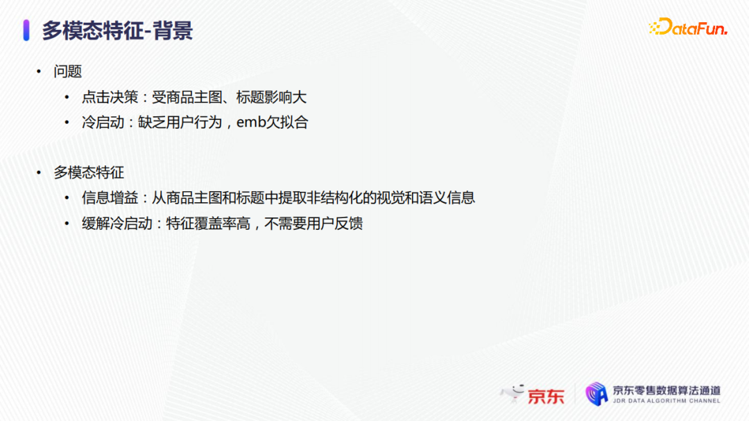 最后介绍一下我们在多模态方面的工作。影响用户点击决策的因素除了商品基本属性,还受商品的主图和标题的影响。此外,推荐系统存在冷启动问题,比如一些新品是缺乏用户反馈的,它们的特征embedding处于欠拟合状态。为了解决这个问题,我们引入了多模态特征。多模态特征可以带来一定的信息增益,商品的主图和标题中非结构化的视觉和语义信息可以比较好地表征商品的状态。另外,多模态特征对缓解冷启动问题效果较好,因为这一类特征不需要用户的反馈,它的特征覆盖率在我们的业务场景下较高。