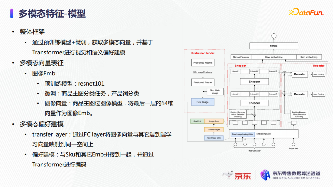 模型整体框架是通过预训练模型+微调分别得到图像和文本向量,并基于Transformer进行视觉和语义偏好的建模。目前图像多模态模型已经在京东推荐中全量上线,而文本模型还在实验中,所以这里主要介绍一下我们在图像方面的工作。