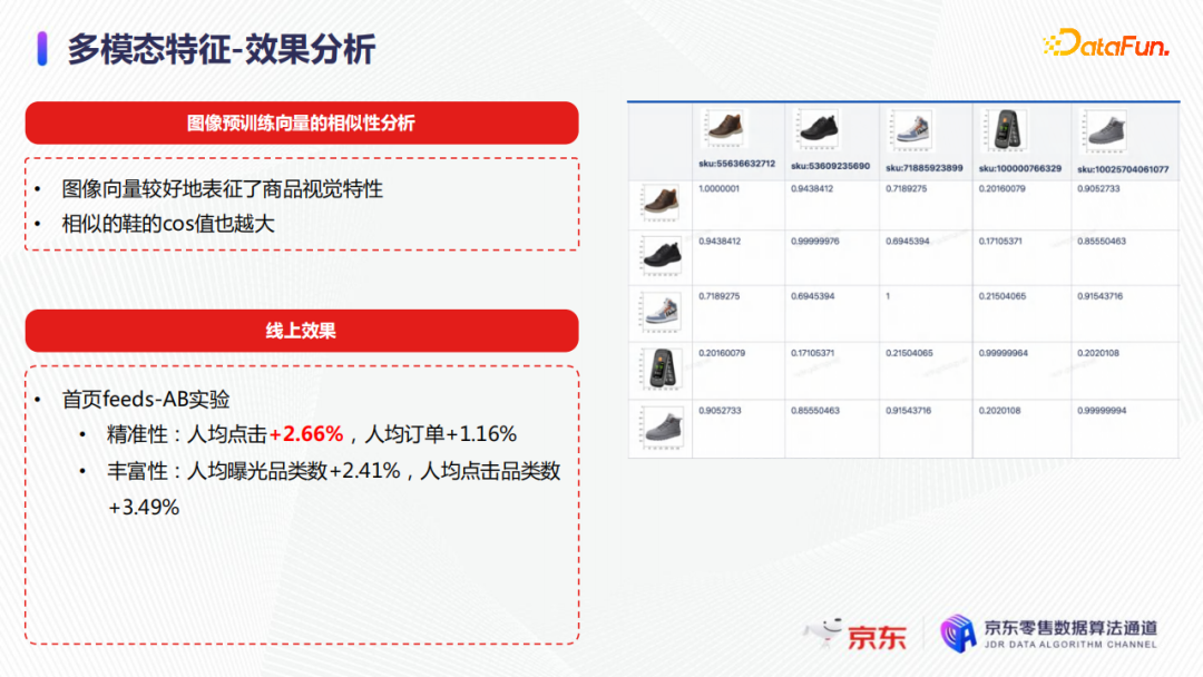 最后我们对图像预训练向量的质量进行了分析,具体做法是筛选一部分商品,观察他们向量的相似度。通过上图可以看到,感官上相近商品的相似度比较高,而当色差较大时相似度也会有相应的降低。如果是差异较大的商品,图像相似度也比较小。在线上效果方面,我们将该方法应用到了首页feeds和首页核心频道,效果比较显著,人均点击分别提升2.6%和5%。