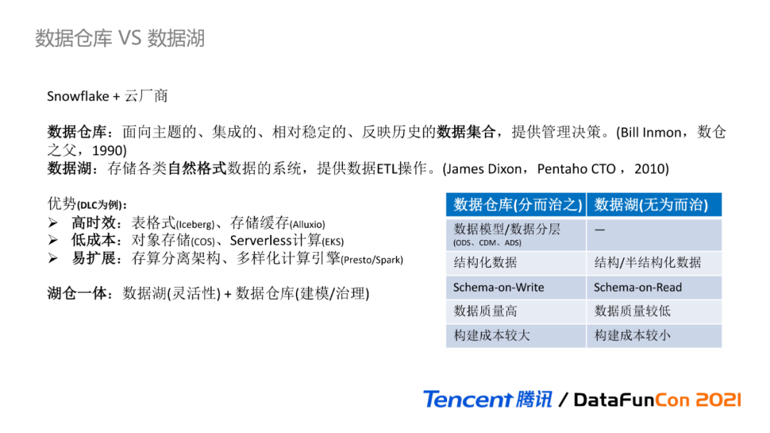 随着Snowflake公司股价高歌猛进和各大云厂商的推广,数据湖已成为近2、3年来大数据领域的新贵之一,而什么是数据湖,数据湖与数据仓库之间的竞争和融合,各家云厂商和数据平台都有自己的解读。从定义来看,数据仓库是1990年由数仓之父Bill Inmon提出,是面向主题的、集成的、相对稳定的、反映历史的数据集合,为上层提供管理决策;而数据湖概念最早是2010年由Pentaho CTO James Dixon提出,是存储各类自然格式数据的系统,提供数据ETL操作。