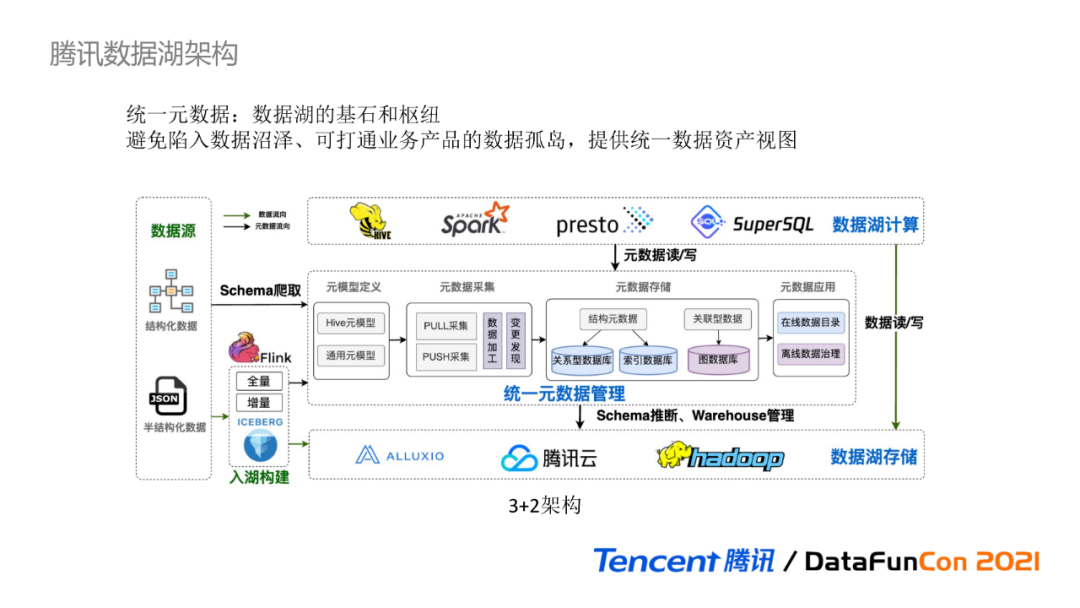 腾讯数据湖的整体架构如下图所示,可以简单理解为3+2架构,由数据湖的三大基本组成要素和两大关联模块构成。