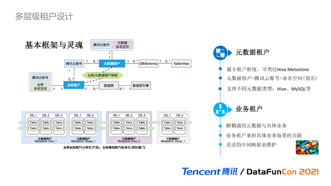 纵向划分:可用于公有云场景,从纵向对元数据租户进行合并划分,一个业务租户对应一个云上产品,每个产品之间元数据是逻辑隔离的,而从腾讯云账号这个更高维度,又可对多个业务产品进行孤岛元数据的打通;