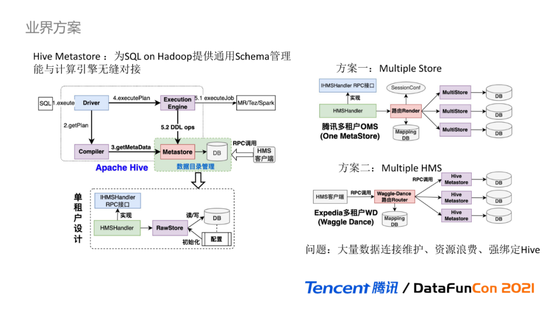 首先来大致回顾Hive执行的流程:由Driver触发SQL解析,Compiler编译器进行编译解析获取逻辑计划对象,会基于Hive Metastore RPC接口获取Schema元数据信息,用于校验和丰富逻辑计划对象。逻辑计划转换为可执行的物理计划,由Execution Engine执行引擎触发执行,其中若涉及元数据变更操作,会调用Hive Metastore RPC接口进行元数据变更,并最终将元数据信息持久化到RDBMS。Hive Metastore是典型的单租户设计,不同用户之间Schema无法完全隔离,无支持创建重名数据库。Hive Metastore的内部设计要点是基于HMSHandler类完全实现IHMSHandler类定义的RPC接口,HMSHandler基于RawStore类从配置中加载持久层的数据库连接信息并初始化,最终数据元数据读写操作由RawStore基于JDO框架实现。