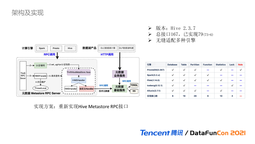 我们最终选择的实现方案是重新实现Hive Metastore RPC接口,大致的实现流程如图所示:新增自定义Handler类继承IHMSHandler,完全重新实现Thrift文件RPC接口。内部增加RPC认证鉴权操作,并最终对外提供RPC Server服务。自定义Handler主要负责处理Metastore逻辑和数据转换操作,真正的元数据持久化通过服务间RPC调用最终由元数据基础服务完成。在线目录除提供完全兼容Hive Metastore的RPC接口外,还提供了HTTP接口供不同的产品使用。该实现方案虽然具有很强的灵活性,但整体实现和维护成本偏高,并不适合所有场景。