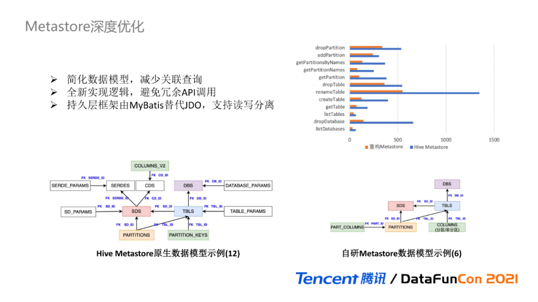 简化后的数据模型,可以减少大量的数据库关联查询,而全新的实现逻辑,从根源上减少了冗余API的调用并进行执行逻辑优化;持久层框架由更灵活的Mybatis替代JDO,支持基于数据库的读写分离。该图展示了100次接口重复调用下,库、表、分区的各接口的耗时对比,可以看出重构后Metastore的耗时远低于原生Hive Metastore耗时。