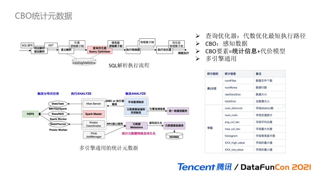 多引擎通用统计元数据的实现流程大致如下:Hive、Spark、Presto支持ANALYZE语句,通过执行ANALYZE分布式任务,计算出统计元数据,计算引擎调用元数据Metastore接口持久化统计元数据。但存在的一个问题:不同的计算引擎使用的统计元数据读写接口可能不同。元数据Metastore作为中转层,会根据计算引擎类型进行转换处理,使得统计元数据对于不同引擎都是通用性。如Presto计算出的统计元数据,在Spark执行SQL,可直接获取对应统计信息进行CBO优化,而无需再次ANALYZE计算。