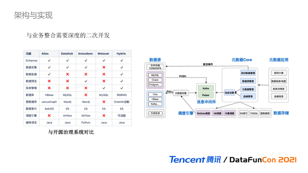 下表展示了各个开源系统与腾讯元数据治理功能的对比,其中腾讯元数据的项目代号为Hybris,可以看出腾讯统一元数据已具备丰富的数据治理能力。除功能的完整性对比外,按照我们的以往经验,开源的数据治理系统在实际业务中很难直接的使用起来,因为数据治理是与业务领域和形态密切相关,直接使用具有一定抽象性且通用的开源系统,只能获取比较基础的数据治理能力,很难得到业务相关的数据价值。若与业务结合,则需要对开源系统进行深度改造的二次开发,因此在数据治理部分我们也选择完全自研。