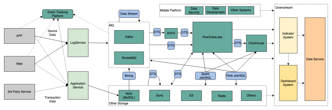 端数据:APP 和 Web 端通过埋点 SDK 发送的,经过 LogService,最终落入 MQ; 业务数据:APP、Web 和第三方服务所进行的业务操作,通过各种应用的服务,最终落入 RDS;RDS 中的数据,经过 Binlog 的方式,汇入 MQ;