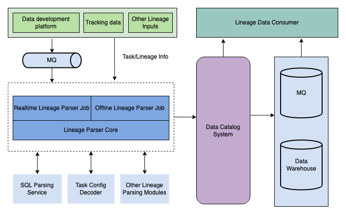 任务接入:以某种方式,从任务管理系统中获取任务信息; 血缘解析:通过解析任务中的信息,获取到血缘数据; 数据导出:负责将血缘数据存储到 Data Catalog 系统中,并供下游系统消费。