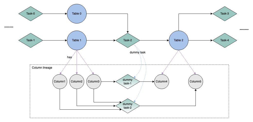 | 1:复用任务节点,为字段之间的关系添加特殊定义的边 | 直观上更容易理解 | 边类型数量可能爆炸,写入与遍历复杂 | 上下游的Column之间映射关系多时,劣势明显 |