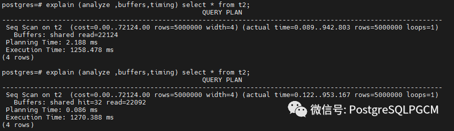 查看执行select * from t2这个sql语句的执行计划,可以看到第一次执行22124个数据库全部是从磁盘读取,第二次读取有32个数据块进行了缓存,对于较大的表尤其是大于四分之一shared_buffers大小的表,就算读取过一次,也只是缓存一小部分数据而已。