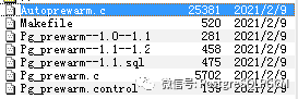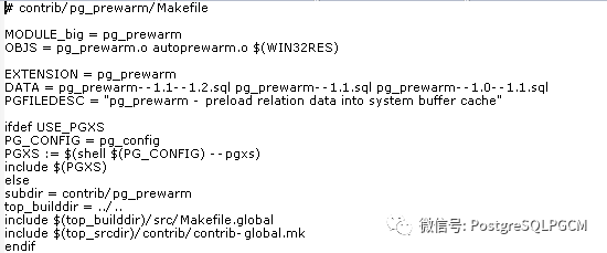 可以看到pg_prewarm目录下有创建一个扩展所必须的所有文件其中包括但不限于sql、c、Makefile、control等文件。
