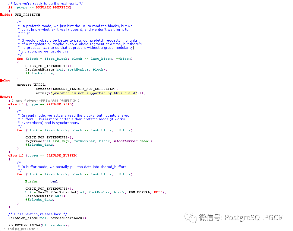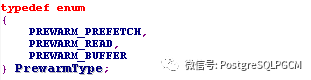 在pg_prewarm.c文件中可以看到只有一个函数pg_prewarm,在源码中定义了一个枚举,表示三种可用的预热方法。prefetch会向操作系统发出异步预取请求(如果支持异步预取),不支持异步预取则抛出一个错误。read会读取要求范围的块。与prefetch 不同,它是同步的并且在所有平台上都被支持,但是可能较慢。buffer会把要求范围的块读入道数据库的缓冲区。