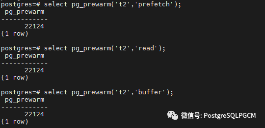 有三种可用的预热方法。prefetch会向操作系统发出异步预取请求(如果支持异步预取),不支持异步预取则抛出一个错误。read会读取要求范围的块。与prefetch 不同,它是同步的并且在所有平台上都被支持,但是可能较慢。buffer会把要求范围的块读入道数据库的缓冲区。
