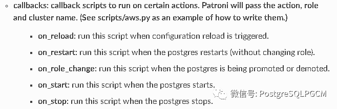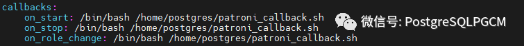 当patroni触发的特定动作比如启动、关闭或者角色切换时会触发一个脚本,同时默认会给这个脚本传三个变量: