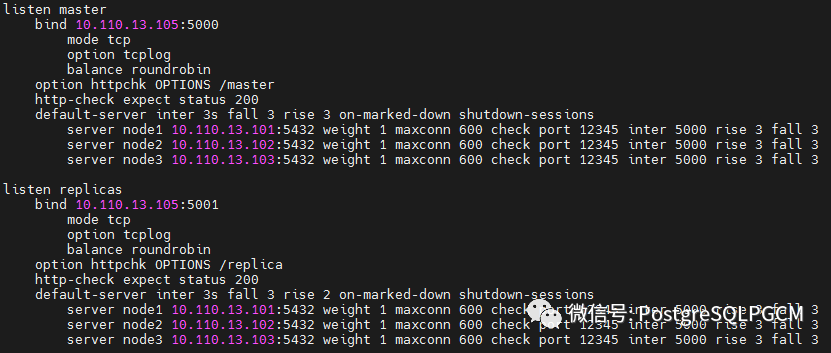 haproxy一直跟随主节点,这样我们就可以不配置haproxy高可用,达到读写分离一直可用的目的,且硬件数量、配置与维护难度都低于文章开篇所提到的方案。