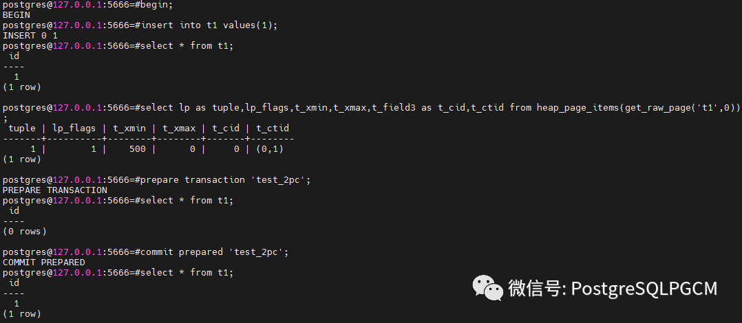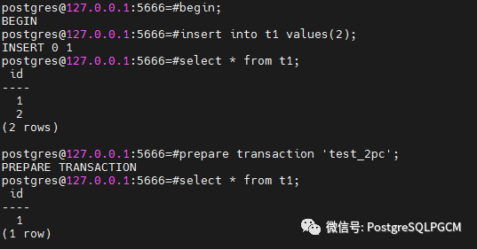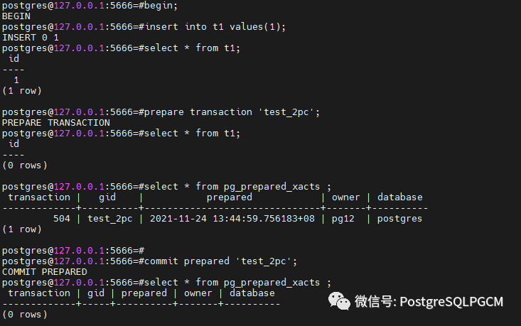 当执行prepare transaction 'test_2pc'也就是一阶段提交后我们已经退出了事务块,但是事务没有完全提交所以我们无法查询到事务块内插入的数据,commit prepared 'test_2pc'也就是二阶段提交后,2PC事务已完成,所以又重新获取到了数据。