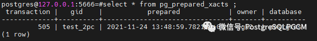 pg_prepared_xacts系统事物记录了2PC事务完成一段提交,未完成二段提交的事务信息。
