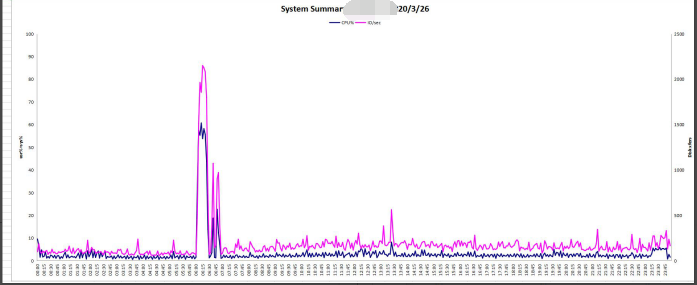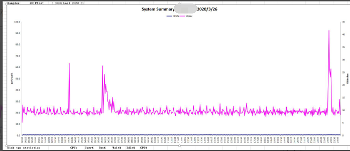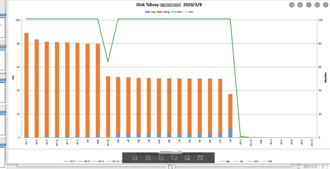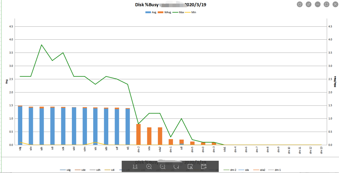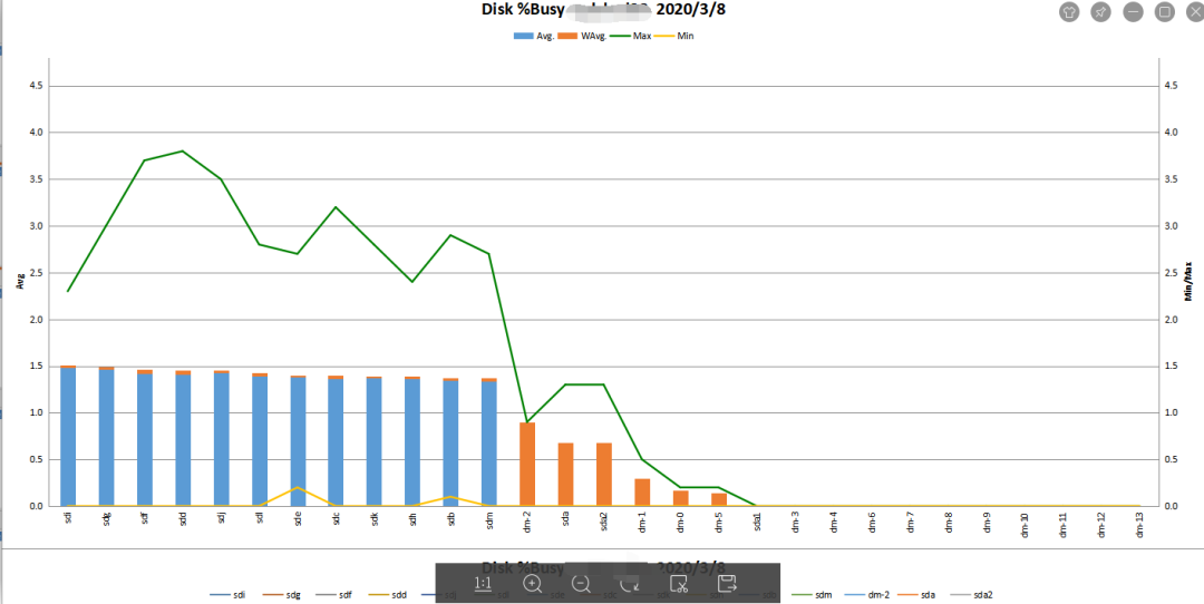 图一为问题主机DISKBUYS报表图,由图一wavg偏高,说明磁盘的繁忙程度相比于同一集群的其他主机更高。