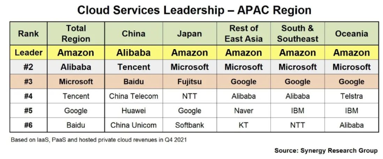 近期,美国市场研究机构Synergy Research Group发布了一份亚太地区的云计算市场数据,统计了2021年第四季度数据各个云厂商的营收,并根据营收进行了排名,看点很多。