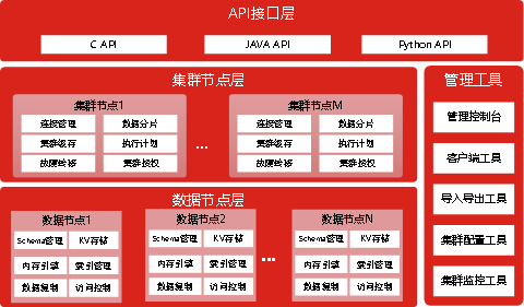 数据节点层由多个分片的数据节点组成,通过KV存储、内存引擎、数据复制、索引等机制实现数据快速处理;